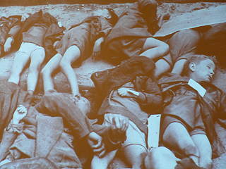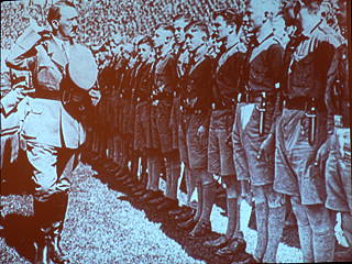 ![]() 16 Text-Bild-Collage 'Kinder als Opfer des Nationalsozialismus' - Bastian Sierich - Bild im Hintergrund mit dem Spruchband 'Nur einer gibt uns die Freiheit: Adolf Hitler' |