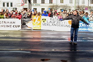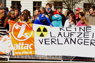| Berlin, 28.3.2010 - attac-Blitzaktion gegen die Laufzeitverlängerung für die Vattenvall-Atomkraftwerke Krümmel und Brunsbüttel (Fotos: Hartmut Ihlefeldt) |