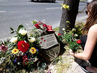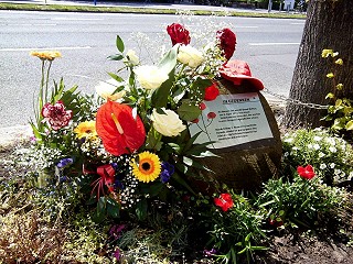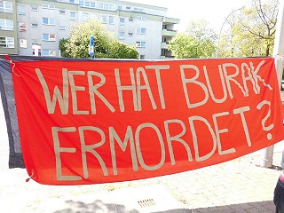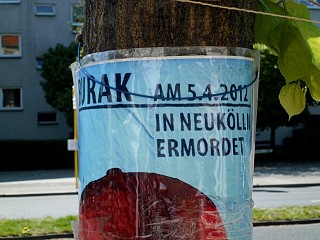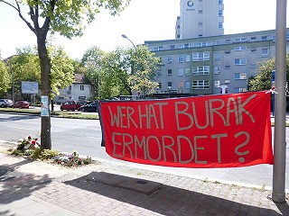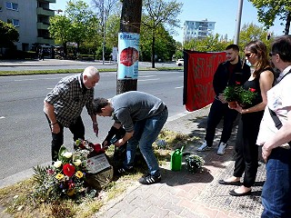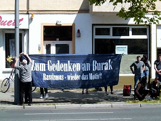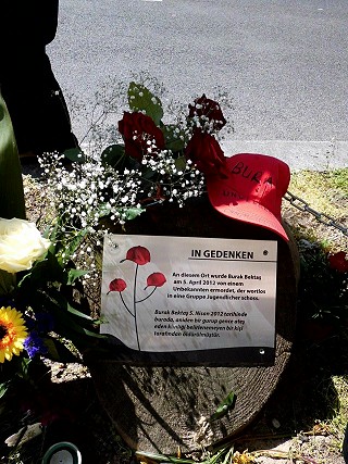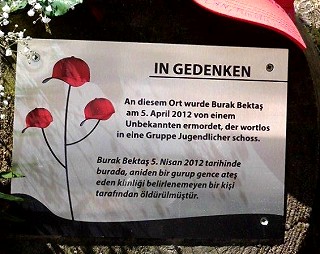 14 Aus dem Aufruf zum Gedenken: "Einen Monat nach dem 4. Todestag Burak Bektas treffen wir uns wieder an der Todesstelle. Nachdem die dortige Gedenktafel mutwillig beschädigt wurde, werden wir sie durch eine neue ersetzen. Außerdem wollen wir die Stelle schön machen, bringt dafür gerne Blumen und andere Dinge mit! Das Gedenken an Burak Bektas muss seinen Platz haben. Dies fordern wir auch mit unserer neuen Kampagne für einen 'lebendigen Gedenkort'. Wir wollen gemeinsam mit den Angehörigen und Freund*innen von Burak einen sichtbaren und lebendigen Gedenkort schaffen, um die Erinnerung an Burak wachzuhalten. Für ein sichtbares und lebendiges Gedenken!" (Siehe auch: gedenkort-fuer-burak.org) | |